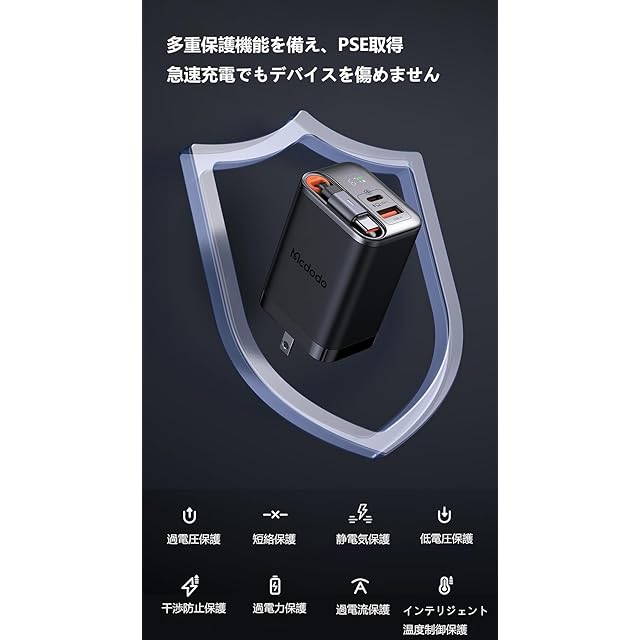 【複数の保護機能が付いており、急速充電の際もデバイスが傷つきません】:過電圧保護、短絡保護、静電気保護、低電圧保護、干渉防止保護、過電力保護、過電流保護、インテリジェント温度制御保護。【世界中で使用可能で、出張の際に便利】:100V〜240Vと幅広い範囲の電圧入力に対応しています。【構造の最適化とアップグレードにより、自動巻き取り式ケーブルを引っ張っても、抜け落ちにくくなりました】:本体はコンパクトで壁面にぴったりとフィットします。壁にプラグを差し込んだ際のバランスと安定性が大幅に向上し、ケーブルが落ちるのを効果的に防ぐことができます。【パッケージ内容】:Mcdodo 67W 急速充電器 自動巻き取り式USB-Cケーブル付き GaN充電器 *1つ、取扱説明書*1つ、カード*1つ。