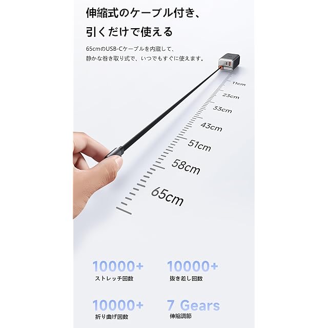 【アップグレードした新モデルは、充電出力がスクリーンに表示】:充電時には総電力と急速充電アイコンをそのまま見ることができるので、充電状況が一目でわかります。【伸縮式ケーブル付き、引っ張り出すだけで使用】:65cmのUSB Type-Cケーブルが付属しており、静かに引っ張り出すことができ、使いたい時にすぐに使用できます。10000回以上、引き出すことができる。10000回以上、プラグの抜き差しができる。10000回以上、曲げることができる。7段階の伸縮調整が可能。自宅、オフィス、旅行など、あらゆるシナリオに対応します。