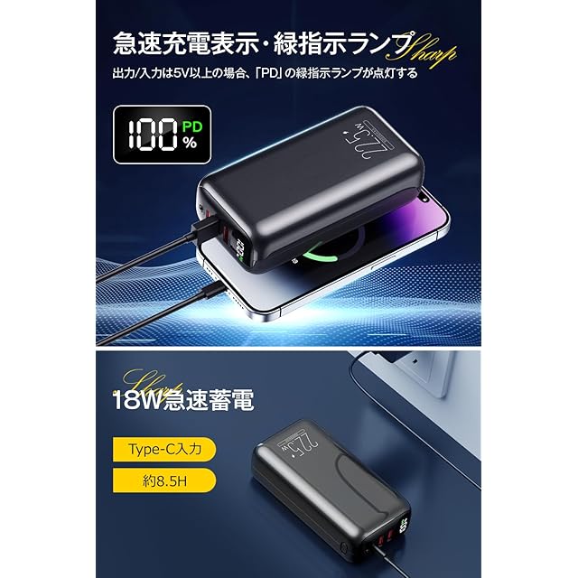 【LCD残量表示・PD急速充電表示】高解像度のディスプレイにより、余剰電力がパーセンテージ形式で表示され、一目瞭然です。出力/入力は5V以上の場合、ディスプレイに「PD」の緑指示ランプが点灯します。この大容量モバイルバッテリーはキャンプや防災時に最適ですが、車内換気扇用バッテリーや外出時の端末用ポータブル充電器としても使用することができます。
