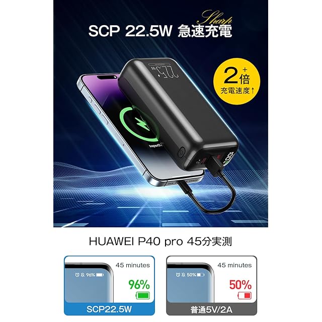 【22.5W/PD20W急速充電・3台同時充電可能】SCP22.5WとPD20Wをサポートしており、抜群の充電速度で充電がエンターテインメントの一部になります。(USB-Cポートの出力はMAX 27Wで、対応機種:iPhone15Promax、iPhone16Promax。)給電パワーは従来の2倍速であり、スマートIC機能も搭載されています。これにより最適な電流制御が行われます。最先端の充電技術によって、この製品はあらゆる種類のスマートフォンに優れた適応性を持っています。