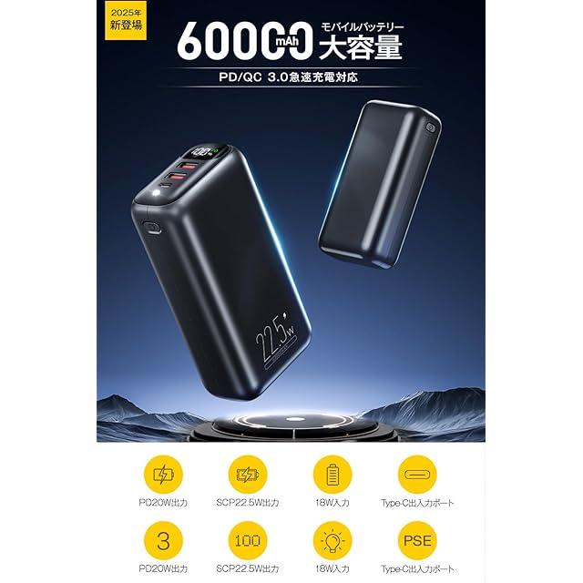 商品名:モバイルバッテリー 大容量 【2025新設計・60000mAh大容量・PD20W急速充電】 バッテリー 携帯充電器 3台同時充電可能 Type-C入出力ポート 最大27W出力 USB-A出力ポート 22.5W スマホ充電器 LCD残量表示 コンパクト LEDライト iPhone/Android各種スマホ対応 PSE技術認証済 安全回路保護 アウトドア/停電/防災緊急用