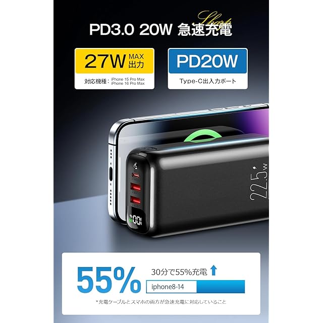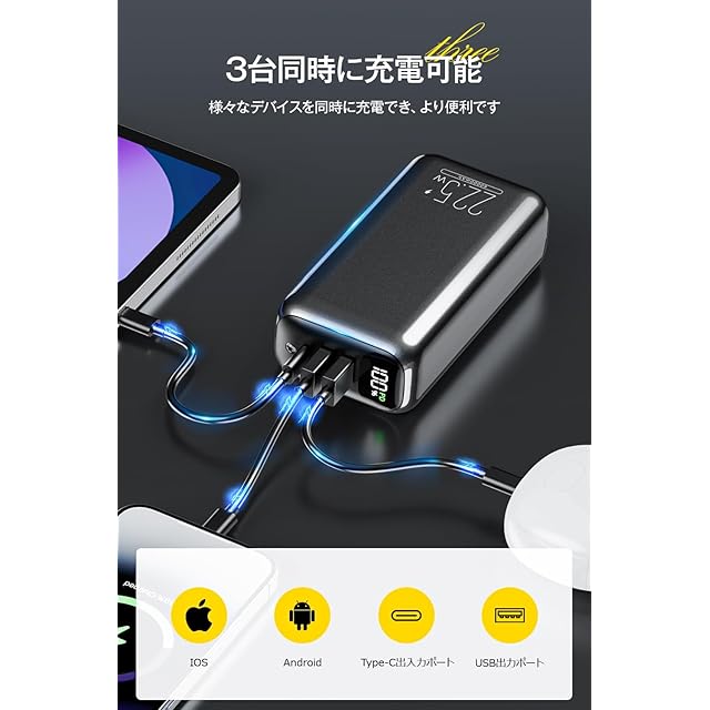 【2025年大人気・60000mAh大容量モバイルバッテリー】22.5W高出力の60000mAhモバイルバッテリーが新登場!60000mAh大容量モバイルバッテリーは、旅行先では家族とシェアしたり、出張中に社用携帯と個人端末を同時に充電できるなど満足感のある容量です。USB-C入出力ポートでモバイルバッテリーへの18W急速蓄電に対応、短時間の蓄電を実現し、外出先でもスマホやタブレットに充電できます。*本製品は60,000mAh(約222Wh)の大容量バッテリーを搭載しているため、一般的な航空会社の規定により飛行機への持ち込みはできません。ご購入の際は、用途や使用環境をご確認のうえお選びください。*
