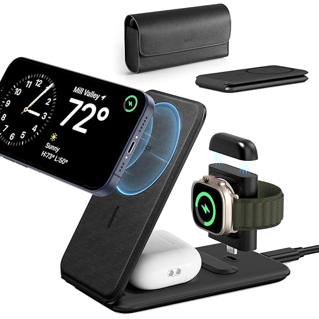 ESR 3in1 MagSafe充電器 折りたたみ式磁気ワイヤレス充電器 MFi認証 Apple Watch公認充電器 トラベル充電ステーション(HaloLock) 持ち運び可能アップルウォッチ充電器 iPhone 16/15/14/13/12用 AirPods 4/3/AirPods Pro用 調節可能な2wayスタンド バッグ付き ブラック