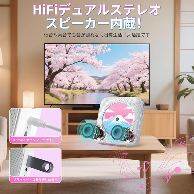 【高音質スピーカー内蔵&リモコン付き】Y01 CDプレイヤーは、Hi-Fiスピーカーを内蔵しており、日常生活の中で低音域や高音域がひびくことなく、音楽そのものを楽しめます。 また、3.5mmヘッドフォン(別売)でプライベートな音楽を楽しめます。更に、付属のリモコンで座ったままで操作できるので、歩き回ることなくいつでも楽しむことができます。ご注意:CD/USBモードで3.5mmイヤホンを差し込むとCDプレーヤーのスピーカー が自動的に停止されます。
