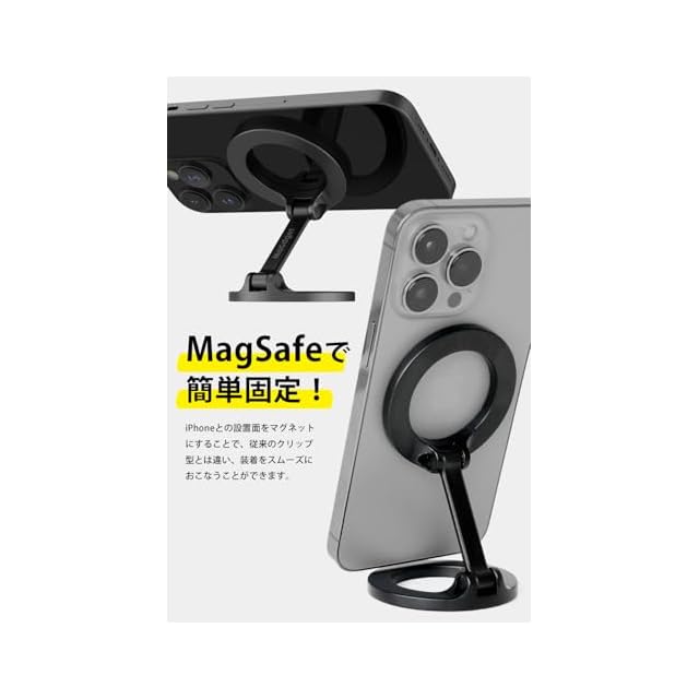 【MagSafeで固定】iPhoneとの設置面をマグネットにすることで、従来のクリップ型とは違い、装着が簡単に。iPhone 12以降のMagSafe対応機種を強力なN52ネオジム磁石でしっかりと固定。縦向き、横向きどちらでも自由自在に設置可能。