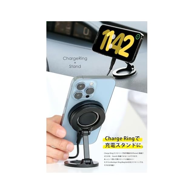 【Charge Ringを吸着したままの使用が可能】チャージリング(別売)と組み合わせて使用すれば、MagSafe充電スタンドに様変わり!マグネットベースの穴にシンデレラフィットするので、スマートに着脱できます。