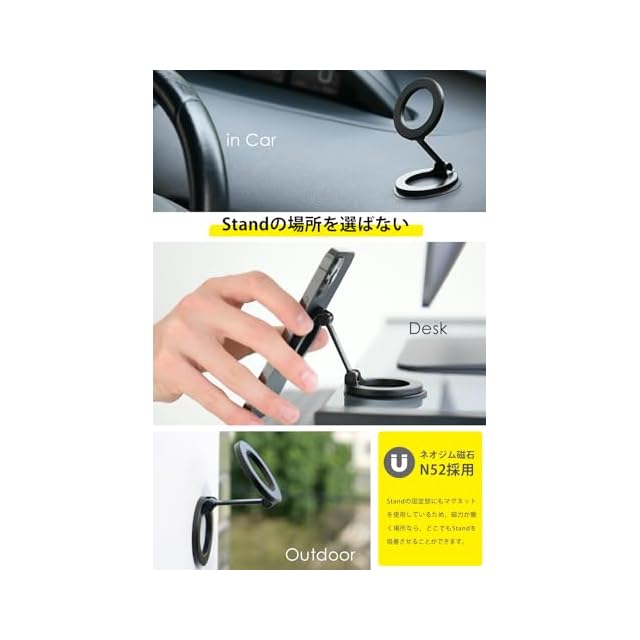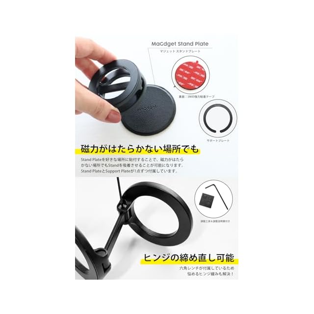 MaGdget Stand/マジェット スタンド MagSafe対応 マグネット スマホスタンド スマホホルダー マルチスタンド 携帯スタンド 車 車載ホルダー 折り畳み式 角度自由 ヒンジ調整工具付き (Black)