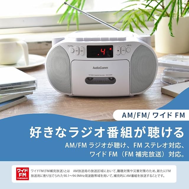◆ワイドFM(FM補完放送)対応 ◆CD-R/RW対応、プログラム再生、1曲リピート/全曲リピート機能付き ◆ヘッドホン端子搭載(φ3.5mmステレオミニジャック) ◆AUX(外部音声入力)端子搭載(φ3.5ステレオミニジャック) ◆乾電池、コンセントの2電源対応 ◆電源コード付属 ◆本体カラーはホワイト