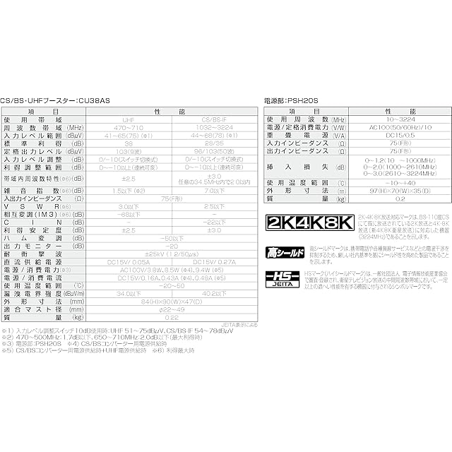 増幅帯域:UHF 38dB、BS/CS 28/35dB