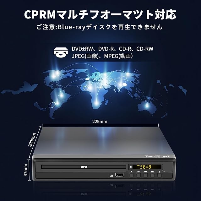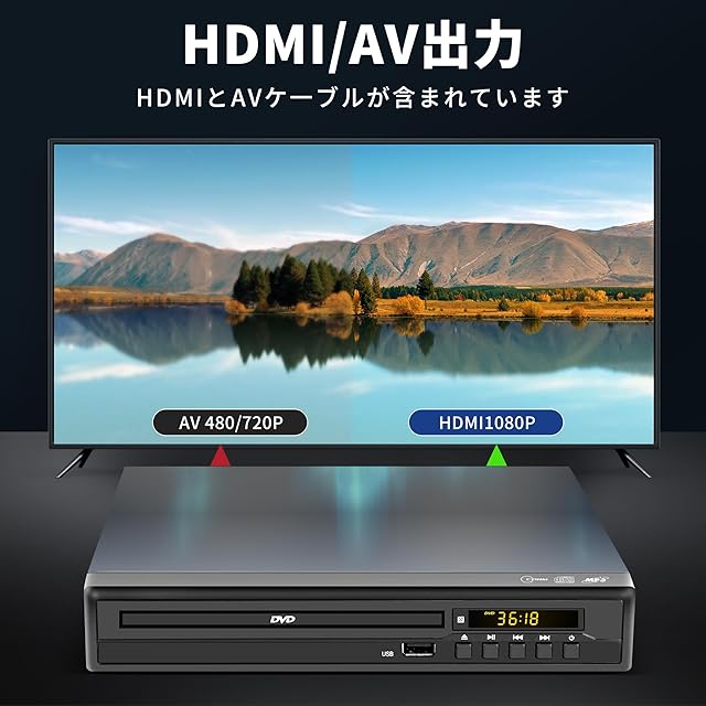 DVDプレーヤー テレビ用 1080P HDMI/AV出力 リージョンフリー CPRM高対応 地デジ録画快適再生 断電記憶再生 多種ディスク形式対応(DVD±R/RW・CD/CD-R/-RW/-G・VCD) 多様なファイル形式再生(MPEG1/2/4(動画)、MP3/WMA(音楽)、JPG/JPEG(画像)) プロジェクター接続可 リモコン付き 日本語取扱説明書付き ブルーレイ非対応