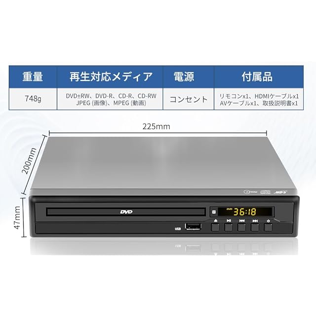 多機能DVDプレーヤーは、 多種ディスク形式対応(DVD±R/RW・CD/CD-R/-RW/-G・VCD) 多様なファイル形式再生(MPEG1/2/4(動画)、MP3/WMA(音楽)、JPG/JPEG(画像))、さまざまなディスクフォーマットに対応しています,電源断後のメモリー再生機能。CPRM機能にも対応しており、地上デジタル放送を録画したDVDも再生可能です。HDMI端子を搭載しており、1080PのフルHD高画質でテレビやプロジェクターに接続できます。AV出力にも対応しているため、旧型テレビでも安心してご利用いただけます。リモコン、HDMIケーブル、AVケーブル、日本語取扱説明書が付属しており、届いてすぐにご使用いただけます。シンプルで使いやすいデザインで、あらゆる世代の方におすすめできる家庭用映像機器です。