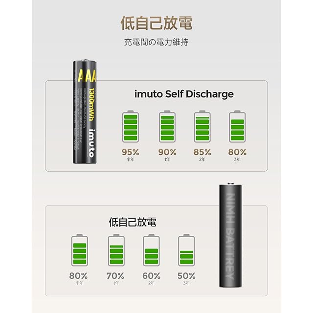 「1.5V充電池&2.2H急速充電」imuto 1.5V高電圧出力の充電式単3リチウム電池は、放電サイクルを通じて、1.5Vの電圧出力を提供ます。1.2Vニッケル水素電池よりも強力で、複数のデバイスに対応することができます。imutoバッテリー充電ケースは急速充電でき、わずか2.2Hで8本のバッテリーを満たすことができます。安全保護を搭載され、充電中の安全性について心配する必要はありません。