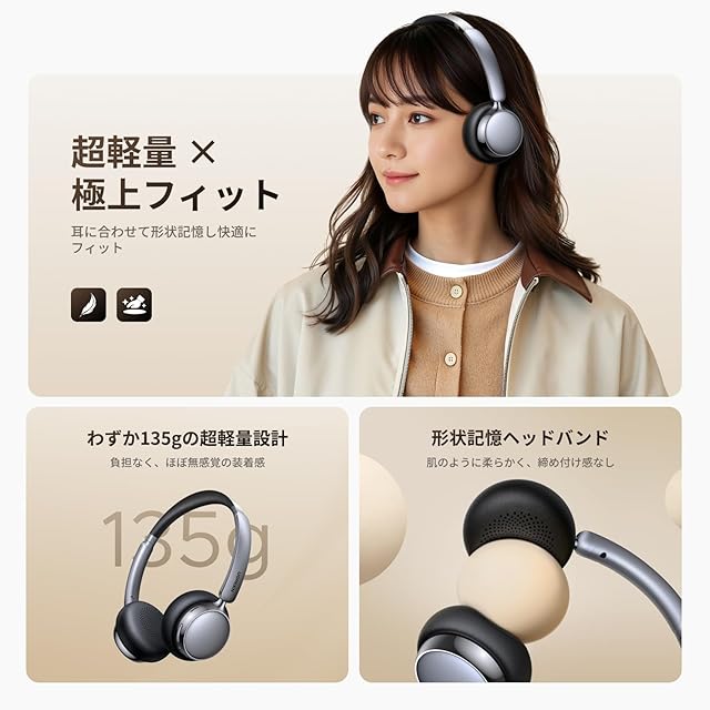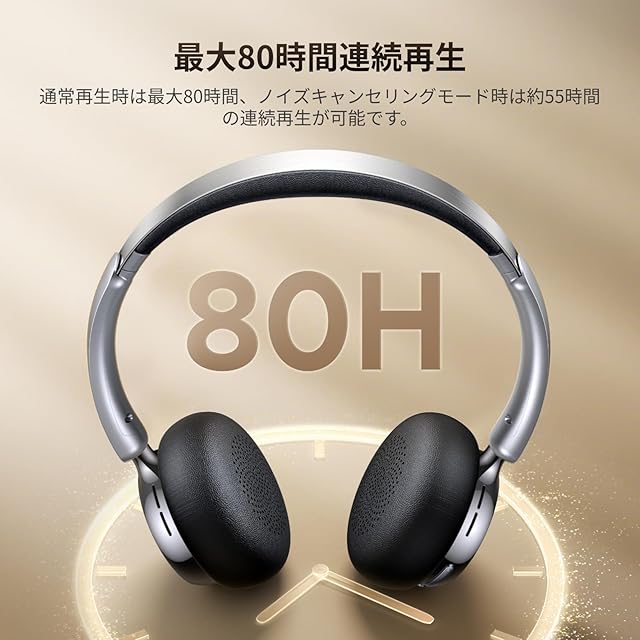 【最大80時間連続再生可能】高性能バッテリーを内蔵し、1回の充電で最大80時間の連続再生が可能。通勤・出張・長時間の移動中も安心して使用でき、いつでもどこでも音楽や動画を楽しめる。※ご注意:再生時間は音量や使用環境により異なります。ノイズキャンセルOFF時で最長約80時間、ノイズキャンセルON時でも最⼤約55時間の再⽣が可能。