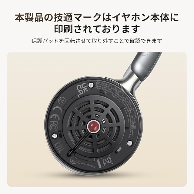 ご注意:本製品の技適マーク等の適合性マークは製品のヘッドパッド内側に印刷されています。確認が必要の際は、ヘッドパッドを回転させてから取り外す必要があります。ぜひご注意ください。