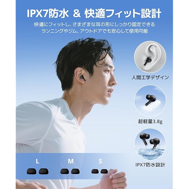 【IPX7防水・軽量フィット ワイヤレスイヤホン】IPX7防水仕様の ワイヤレスイヤホン は、雨や汗に強く、ランニング・ジム・キャンプなどのアウトドアシーンでも安心。片耳3.8gの軽量設計と人間工学に基づくフィット感で、長時間装着しても快適です。イヤホン bluetooth 接続で安定した音質を保ち、ブルートゥース イヤホン の防水性能がスポーツ中の汗や急な雨から守ります。S/M/Lイヤーチップ付きで耳にしっかりフィットし、ズレにくい仕様。高音質を保ちながら日常からスポーツまで幅広く使え、プレゼントにも最適な ワイヤレスイヤホン です。