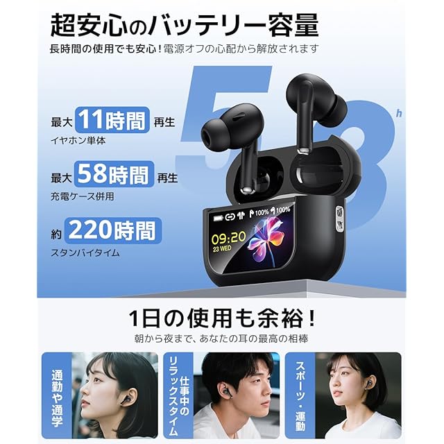 【液晶タッチ操作搭載・次世代 ワイヤレスイヤホン 】最新型の ワイヤレスイヤホン は、ただの イヤホン bluetooth では実現できない、直感的な液晶タッチ操作を搭載しています。充電式ケースに内蔵された高解像度 ディスプレイ イヤホン は、残量表示に加え、音楽再生や通話、EQモード切替、ノイズキャンセリング強弱調整、外音取込切替、さらにカメラ遠隔操作まで可能な 画面付きイヤホン 。 ブルートゥース イヤホン とスマホを接続すれば、混雑した電車内や外出先でも、ケースをスワイプするだけで全操作が完結します。100種類以上の壁紙カスタマイズ機能で、自分だけのデザインを楽しめるほか、USB対応で充電もスムーズ。高音質と利便性を両立し、ビジネスからカジュアルまで活躍する プレゼントにも最適 な ワイヤレス イヤホン です。