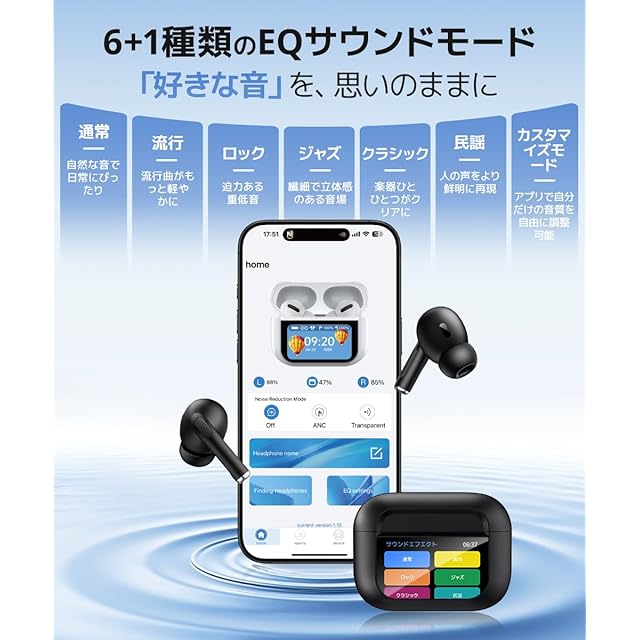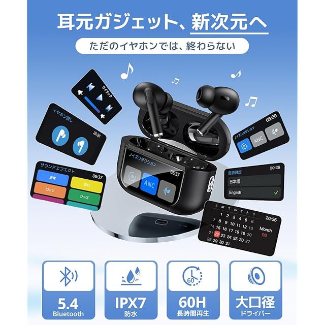商品名:ワイヤレスイヤホン 【2025新登場・液晶で操る未来型】 イヤホン bluetooth ノイズキャンセリング ぶるーとゅーす ワイヤレス イヤフォン 通話 音質コントロール可 iphone 大口径 長時間再生 低遅延 カナル型 IPX7 防水 軽量 残量表示 gps 追跡機能 ハンズフリー 急速充電 3Way(完全遮音+通常+外部音取込) アプリ連動 EQモード 通話発信・履歴 カメラ遠隔操作