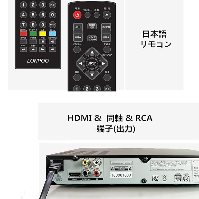商品名:LONPOO DVD ブルーレイプレーヤー フルHD1080p DVDプレーヤー CPRM再生可能 HDMI/同軸/AV出力 高速起動 PAL/NTSC対応 USB/外付けHDD対応 Blu-rayリージョンA/1 AV/HDMIケーブル付き