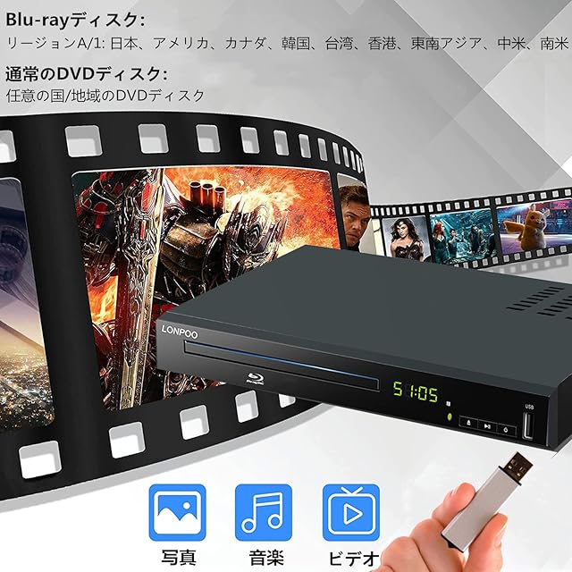 LONPOO DVD ブルーレイプレーヤー フルHD1080p DVDプレーヤー CPRM再生可能 HDMI/同軸/AV出力 高速起動 PAL/NTSC対応 USB/外付けHDD対応 Blu-rayリージョンA/1 AV/HDMIケーブル付き