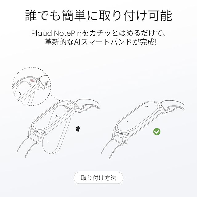 【取り付け簡単】NotePin本体をバンドのホルダー部にカチッとはめるだけです。工具や複雑な操作は不要ですぐに装着が完了します。どなたでも簡単に扱えます。