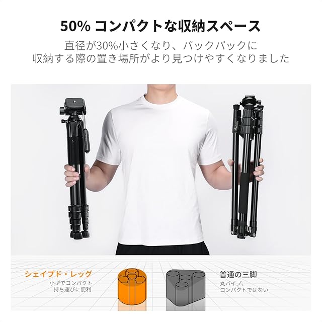 コンパクトなデザイン:軽量な三脚は五角形のチューブデザインで、その斬新な外観により折りたたみと収納が簡単です。三脚の重量はわずか1.2kg、折りたたみサイズはわずか46cmです。携帯性に優れ、アウトドアの撮影や旅行、桜祭り、お花火大会、紅葉祭りの撮影に適しています。