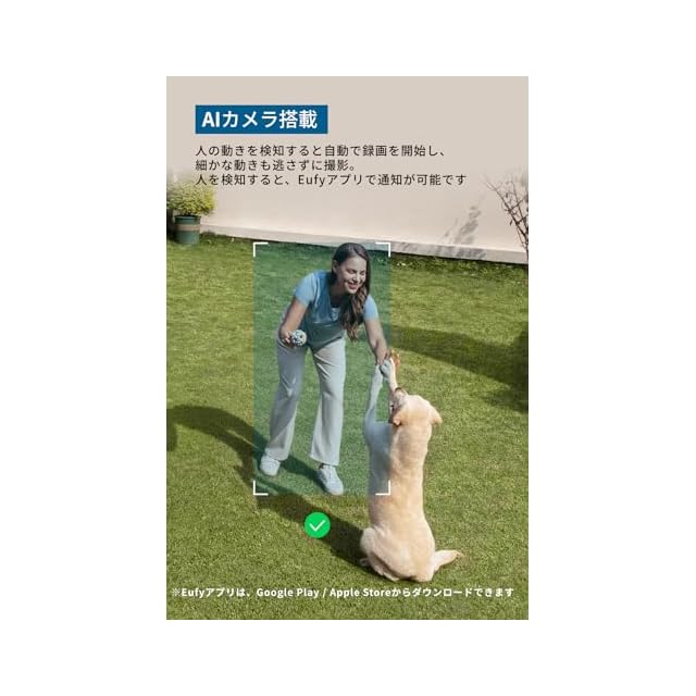 AIカメラ搭載:人の動きを検知すると自動で録画を開始し、細かな動きも逃さずに撮影。人を検知すると、Eufyアプリで通知が可能です ※Eufyアプリは、Google Play / Apple Storeからダウンロードできます。
