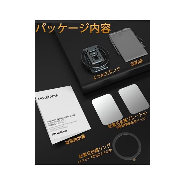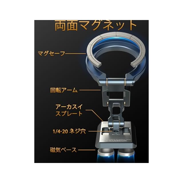 商品名:MOSENVKA スマホスタンド MagSafe対応 両面マグネット 超强磁力 マグセーフ スマホホルダー 三脚マウント マグネット 車載ホルダー アルミ合金製 折りたたみ式 三脚架対応 1/4インチネジ穴&アーカベース 卓上三脚 携帯リング 角度自由 携帯スタンド 車 ジム用 iPhone 17 Pro Max 16 15 14 13 12および全てのスマホに対応 BK2-PRO