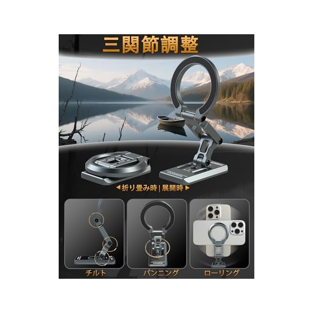 <b>MOSENVKA MagSafe スマホスタンド 強力磁石 車載用 360度回転 デュアル磁気ホルダー 超薄型 折りたたみ式 1/4インチネジ穴&アーカスイスマウント付き iPhone 17/16/15/14/13/12 Max Plus対応。</b><br><br> --内蔵アーカスイスマウントにより、撮影機器(カメラやスマホスタンドなど)と三脚やジンバル間のクイック着脱を実現します<br><br> --三脚および1/4インチマウントを備えたあらゆるデバイス用の1/4インチネジ穴<br><br> --両面にマグネットを内蔵したアイフォン12/13/14/15/16/17シリーズ専用のマグセーフスマホリングスタンド。<br><br> --超薄型デザインにより、軽くて持ち運びしやすい設計です。<br><br> --両面がマグネット仕様のMagSafe対応のスマホスタンドです。冷蔵庫などの表面が鉄素材であればそのままピタッと張り付きます。<br><br> --素材は高級感あるアルミ合金仕様。酸化防止アルミ合金素材により色褪せと錆びに非常に強い仕様となっています --ダブル強力マグネットデザイン: スマートフォンをしっかりと固定。<br><br> --車載/卓上/壁掛け 全シーン対応。<br><br> --いろんな機種に対応,MagSafe磁気デザインを採用して、iPhone 17/16/15/14/13シリーズ以降のバージョンとMagSafeケースに対応できます。<br><br> --360°の自由角度調整。<br><br> --超強力で瞬間吸着:超強力なN52グレードの磁石を採用しており、驚くほどの吸着力を実現します<br><br>