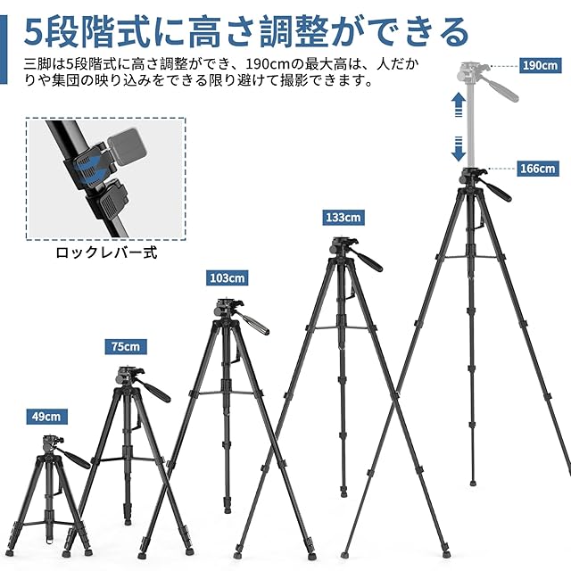 商品名:ZOCUS 三脚 リモコン付き 一脚可変式 全高1900mm 脚径26mm 5段 3Way雲台 水準器 クイックシュー式 アルミ製 スマホホルダー キャリングバッグ付き 一眼レフ ビデオ カメラ スマホ対応 ブラック