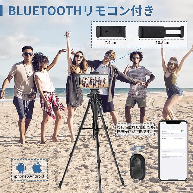 【カメラ&スマホ対応】三脚のパイプ径は26mmで中級機一眼レフ+望遠レンズにも対応できます。水平・垂直に加えて横から縦方向にも動かせる3Wayタイプの雲台を採用、構図の微調整や手ブレ防止を重視したい方に適しています。また、Bluetoothでスマホと接続するだけで使用でき、約10m離れた場所でも遠隔操作が可能です。