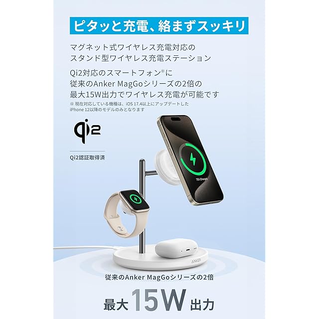 ピタッと充電、絡まずスッキリ:マグネット式ワイヤレス充電対応の3-in-1充電器。Qi2対応のスマートフォンに従来のAnker MagGoシリーズの2倍の最大15W出力でワイヤレス充電が可能です。(※ 現在対応している機種は、iOS 17.4以上にアップデートしたiPhone 12以降のモデルのみとなります)