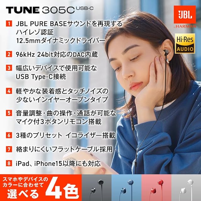 JBL TUNE 305Cは周囲の音も自然に取り込む完全に耳を塞がないオープン型ハウジングを採用した有線インイヤーイヤホン。軽やかな装着感ながらJBLならではのパワフルサウンドを実現しています。また、カナル型有線イヤホンとは違い、タッチノイズの少なさも魅力です。 イヤホン本体には3種類のイコライザーがプリセットされており、アプリなく容易に切り替えられます。クリアな音声での会話が必要なWEB会議や、低音を感じて迫力を楽しみたい映画の視聴やゲームプレイの際など、あらゆるシーンで、片手で簡単に最良のサウンドが選べます。USB Type-C接続で、最新のデバイスでも利用できます。最大96 kHz/24 bit DAC内蔵。