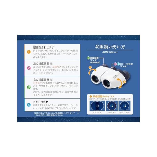 【ビクセン双眼鏡アクティ MS8×21 A 仕様】 [対物レンズ有効径:21mm] [倍率:8倍] [プリズム素材:BK7] [コーティング:対物接眼マルチコート] [実視界:7度] [見掛視界:52.1度] [1000m先視界:122m] [ひとみ径:2.6mm] [明るさ:6.8] [重量:160g] [サイズ:8.1 x 10.9 x 4.3 cm]