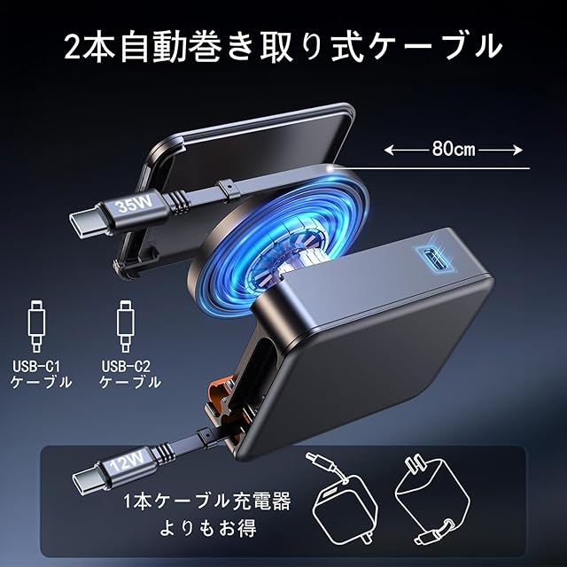 【新時代の多機能デザインで、瞬間フル充電】弊社の自動巻き取り式充電器は、2本USB-Cケーブル & 1つのUSB-C ポートを搭載し、様々なデバイスの充電ニーズに完璧に対応。弊社のType-C充電器は2本Type-Cケーブル一体型なので、接続するだけで手軽に充電可能です。ケーブルは便利な巻き取り式の設計を採用して、バッグの中でケーブルが絡まることなく、80cmまで自由に長さを調整できます。収納にも大変に便利で、少し長めに引っ張ると、ロックが解除されて、自動的に収納されます。伸縮自由、簡単に収納できるし、普段外出、旅行、オフィス、出張などに携帯用はおすすめ!
