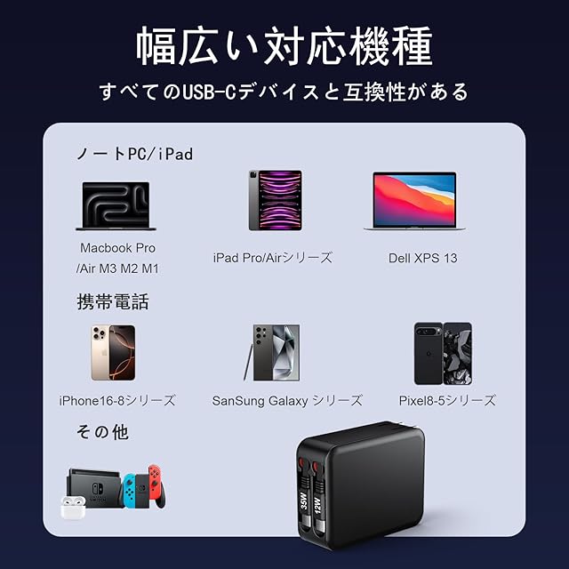 【幅広い互換性、多様なデバイスに対応】for iPhone16/ iPhone15/ iPhone14/ iPhone13/ iPhone12/ iPhone11/ iPhoneXR/ iPhoneXS/ iPhoneX/ iPhone8/ iPhone7/ iPhoneSEシリーズ、Android(Galaxy、Xperia、Aquosなど)、iPad/iPad Pro/iPad mini、iWatch、Switchなど、多様な機器に対応しています。また世界各国の電圧(AC 100-240V)に対応しているので海外旅行や出張に大活躍です。