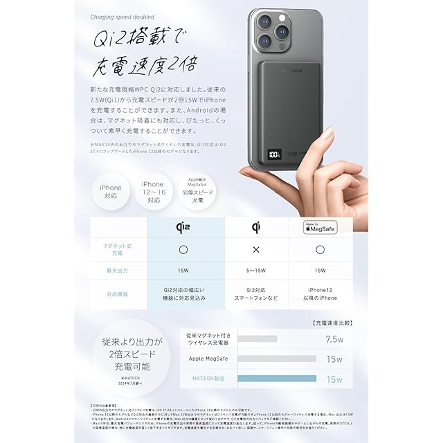 【Qi2搭載で充電速度2倍】新たな充電規格WPC Qi2に対応しました。従来の7.5W(Qi1)から充電スピードが2倍15WでiPhoneを充電することができます。また、Androidの場合は、マグネット吸着にも対応し、ぴたっと、くっついて素早く充電することができます