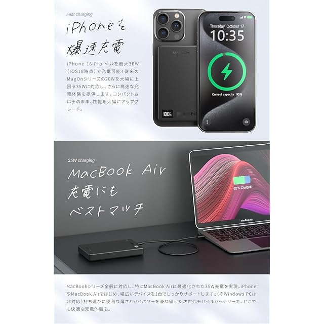 【MacBook Air充電にもベストマッチ】MacBookシリーズ全般に対応し、特にMacBook Airに最適化された35W充電を実現。iPhoneやMacBook Airをはじめ、幅広いデバイスを1台でしっかりサポートします。(※Windows PCは非対応)持ち運びに便利な薄さとハイパワーを兼ね備えた次世代モバイルバッテリーで、どこでも快適な充電体験を。