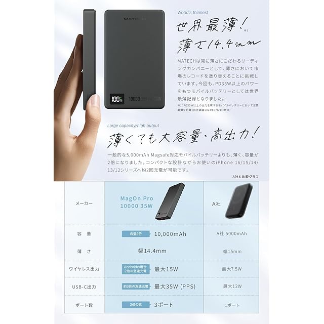MATECH Qi2 モバイルバッテリー マグセーフ 薄型 小型 軽量 PD 35W 30W対応(史上最薄サイズ14.4mm, 10000mAh) MagSafe対応マグネット式 ワイヤレス充電 タイプC iPhone12~シリーズに対応 MagOn Pro 10000 35W Qi2