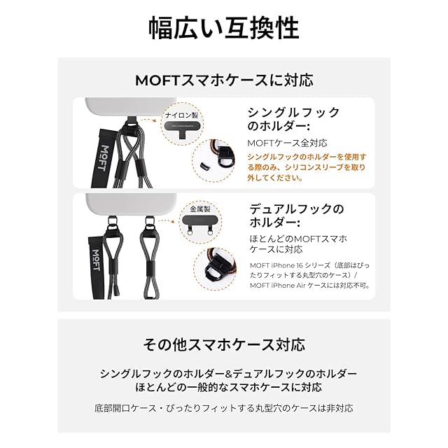【豊富なケースに、自由に対応】 シングルフックとデュアルフックの2種類を用意しており、スマートフォンケースに合わせて最適なフックを選択できます。MOFTケースはもちろん、市販のほとんどのスマートフォンケースにも対応しているため、安心して使用できます。さらに、スピーカー穴の開口部や充電ポートを利用して装着でき、MagSafeスタンドやワイヤレス充電の使用を妨げません。