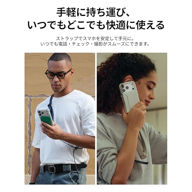 【絡まずスッキリ、快適フィット】 360°回転するバックルを搭載しているため、ストラップの絡まりを防ぎ、どんな動きにも快適に対応します。体にフィットして快適に装着できるため、通勤や外出中でもストレスなくスマートフォンを携帯できます。