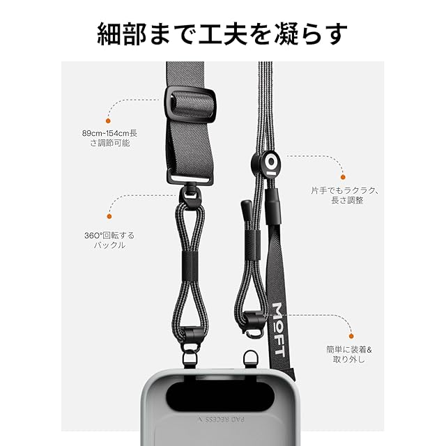 商品名:[MOFT] 公式直営店 スマホストラップ アップグレード版 首掛け/斜め掛け/肩掛け 携帯ストラップ スマホショルダー 軽量快適 長さ83~150cm調整 エコ素材 金属製ホルダー&クリップ 耐荷重10kg 断裂しにくい スマホショルダーストラップ 2種類のフックー付き iPhone/Android全機種対応 コーデ自在 着脱簡単 小物対応 落下防止(ブラック)