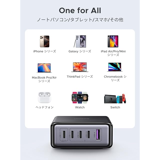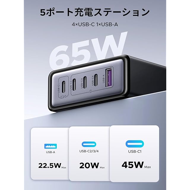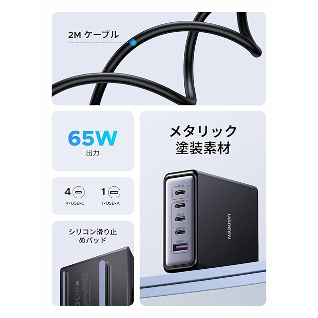 商品名:UGREEN 充電器 Type-C 65W 5ポート PD 卓上急速充電器【USB-C×4 USB-A×1】同時充電可能 PD/QC4+/PPS規格対応 電源ケーブル付き PSE技術基準適合 iphone17-8シリーズ/GalaxyS24-S10シリーズ/Xperia/Pixel Pro/Macbook/スマホ/タブレット/ノートPCなどに対応