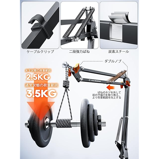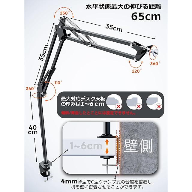 【最大耐荷重2.5kg!・安定性抜群・C型クランプ】 カメラアームスタンドはアルミニウムアーム、上質なスプリング、錆びにくいネジを採用し、頑丈で揺れなく、2.5kgまでのカメラやスマートフォンが設置可能、安心して撮影ができます。 わずかに3mm薄型でC型クランプ式の台座を搭載し、机を壁に密着されることができます。 CACENCANの手元撮影用スマホスタンドはコの字型、丸型台座、三脚の俯瞰撮影スタンドに比べ、場所を取らずに設置可能で卓上の作業スペースの邪魔になりません、快適な撮影ができます。