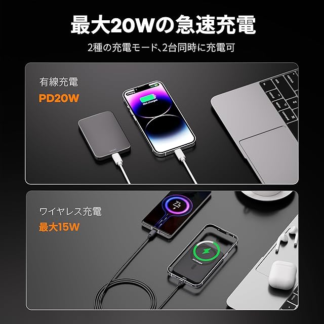 Yamisanの Magsafe 対応モバイルバッテリーは魅力的な製品です。5000mAh 大容量で、重さ117g、厚さ8mm のコンパクトなサイズで持ち運びに便利です。QC3.0 と PD3.0 規格をサポート、ワイヤレス充電(15W)とType-Cポート充電(20W)で急速充電に対応できます。18 個の強力磁石でとしっかりと固定でき、安定した充電環境を提供します。高品質バッテリー内蔵、安全設計で1000回以上充電可能です。iPhone同源材質で耐久性あり、アルミニウム合金は熱伝導性良く、充電速度低下防止。シリコン素材は柔らかくスマホを傷つけない。iPhone同源知能チップを採用し、過熱保護、過充電保護などの機能を備えており、デバイスを様々な面から守ります。