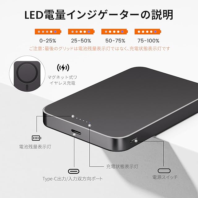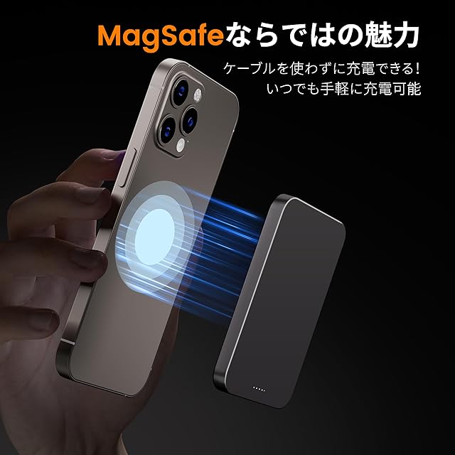 【業界最強磁力、軽く貼るだけで即充電】Yamisan のマグネット式ワイヤレスモバイルバッテリーには18個のN52級強力磁石が内蔵され、軽く貼るだけでしっかりと吸着できます。市販品より15倍も強い磁力を持ち、位置ずれによる充電不能という普通のワイヤレス充電の弱点を効果的に克服し、バッグやポケットに入れても安定して充電できます。iPhoneと一緒にMagsafe充電を手に持って行うことができるため、ケーブルが不要で有線充電の煩わしさを解消します。※ご注意:本製品のマグセーフ充電機能は、Magsafe対応のスマートフォンなどのデバイスおよび磁石式ワイヤレス充電に対応する場合のみ使用可能です。