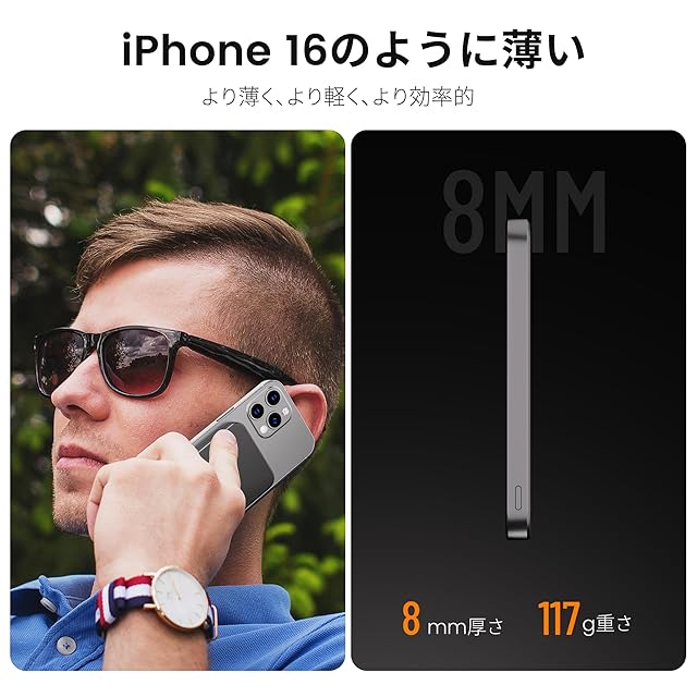 【0.8cm業界最薄型!持ち運びにとても便利】厚さはわずか0.8cmで、驚くほど薄くて軽いです。スマホに装着すると、まるで何もつけていないようなスリムさです。財布やポケット、カバンに入れてもかさばりません。旅行、出張中に大活躍してくれます!普段から災害時まで役立つ機能が満載のマグネット モバイルバッテリーです!