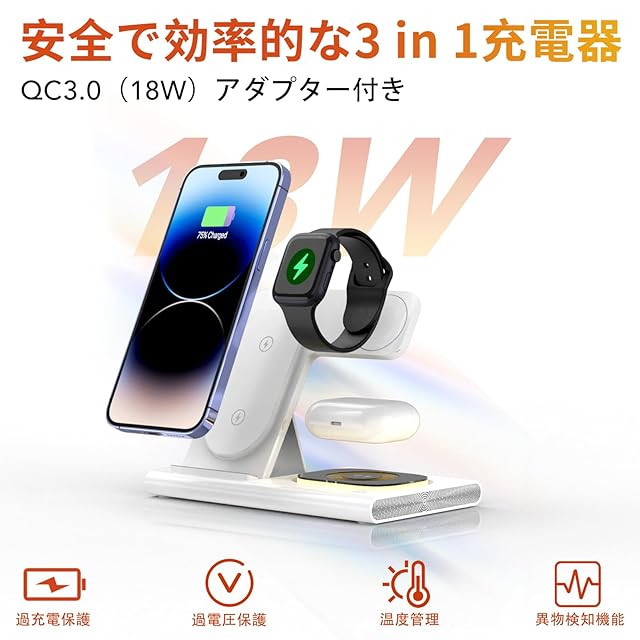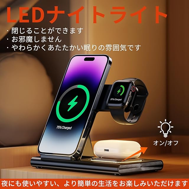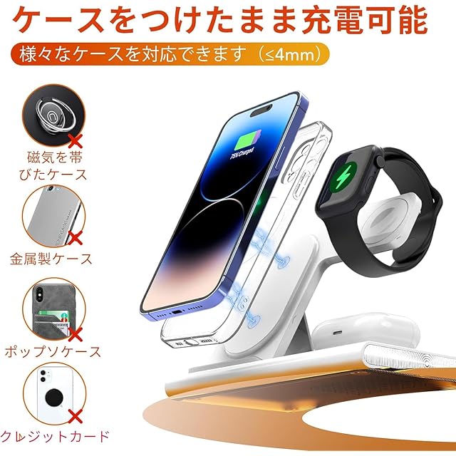 ▲大事なこと:iPhone 13 mini/12 miniに対応できません。watchの充電部分はApple Watch専用。ご購入する前に、対応デバイスをちゃんと確認ください。(iPhone15/14 Pro maxは充電時に横向/きにする必要があります。) 【多機種対応】★5Wに適応できるApple Watch 充電器:Apple watch Series 11/Ultra 3/ultra/ultra2//SE 3/SE/ Apple Watch Series10/9/8/7/6/ 5/4/3/2;Airpods Pro 3/pro2/Airpods 4/3世代/pro/2代(ワイヤレス充電。QI対応のワイヤレスイヤホンケースのみ適用)。★7.5Wに適応できる:iPhone 充電器:iphone17/17 Air/17 Pro/17 Pro Max/16/16 plus/16 pro promax/15/14/13/12plus/Pro/Pro Max/iPhone 11など★10Wに適応できる機種は以下:Galaxy S20Ultra/S20+/S10e/S10/9/S9/8/S8などのQi対応機