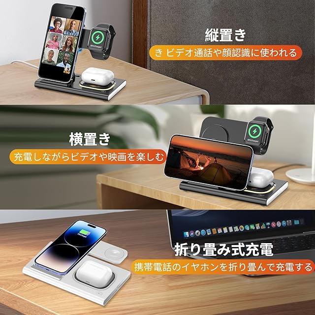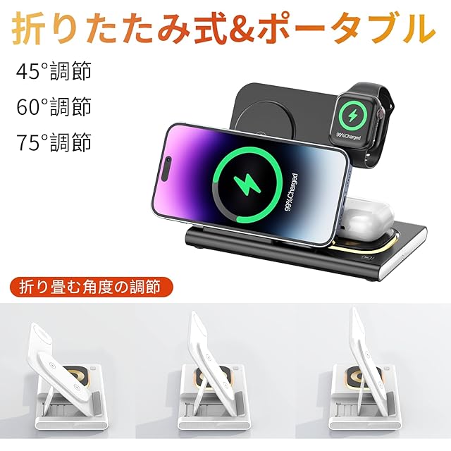 【便利性】最新のApple watch Ultra 3/ultra 2 /series 11/10/9/8//SE 3/iPhone17/17 Air/17 Pro/17 Pro Max/16/15/14/AirPod 4置くだけで同時充電できます。頻繁にコネクターの抜き差しの必要がありません。人体工学設計の45度斜角の設計で、さらに幅広い充電領域により、垂直と水平状態での充電が可能に。充電しながら映画を見ることできます。