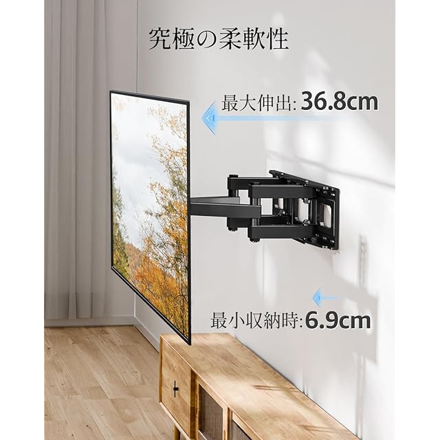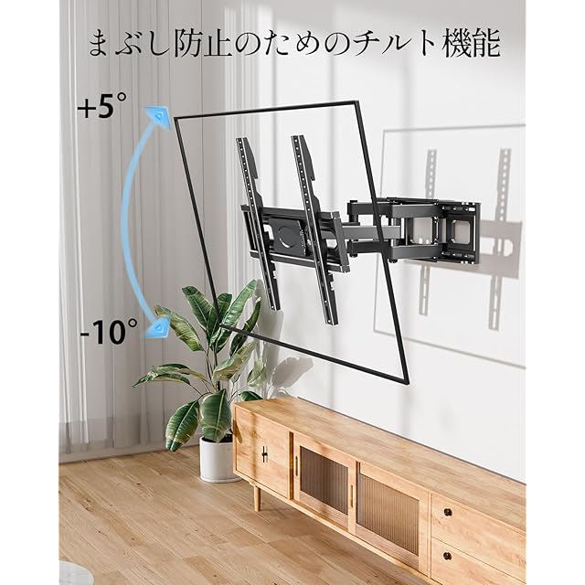 【見やすい角度調整】上向き+5°、下向き-10°、目線に合わせて写りこみを回避。左右に45°の角度をつけて、部屋のどこに見ても正面に。壁から69mm~368mm、前に出してより見やすく、見ない時はスッキリと収納。気楽な視聴環境を構築します。