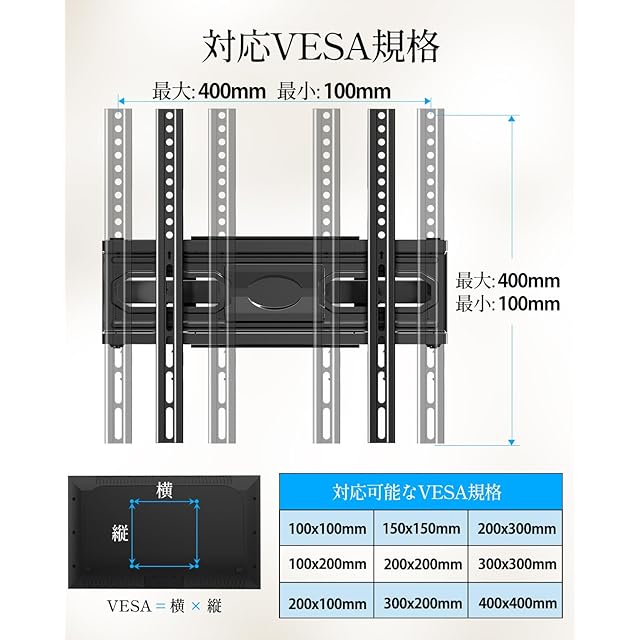【ご購入前に】本壁掛けテレビ金具の目安対応サイズは26~65インチで、耐荷重は最大45kgです。対応VESA規格(テレビ背面のネジ穴の距離)は横二点間:100~400mm、縦二点間:100~400mm。ご購入前にテレビの情報をご確認ください。対応かどうかを迷う時、以下の手順でご連絡ください。「アカウントサービス」→「注文履歴」→「販売元」→「質問する?」